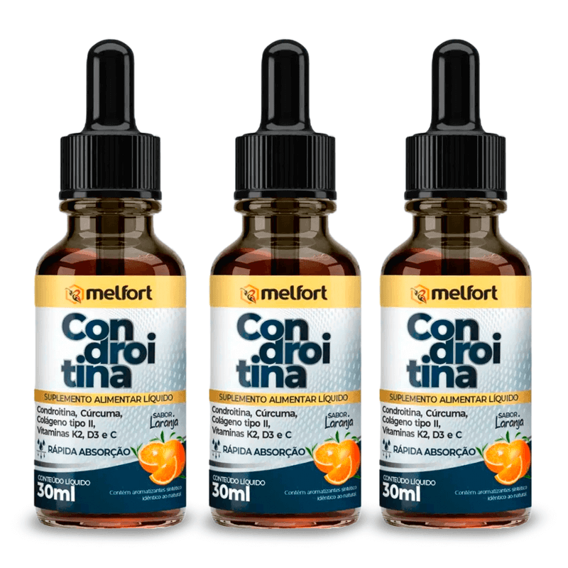 Kit 3x Condroitina com Cúrcuma, Colágeno Tipo II em Gotas Sabor Laranja 30ml - Melfort